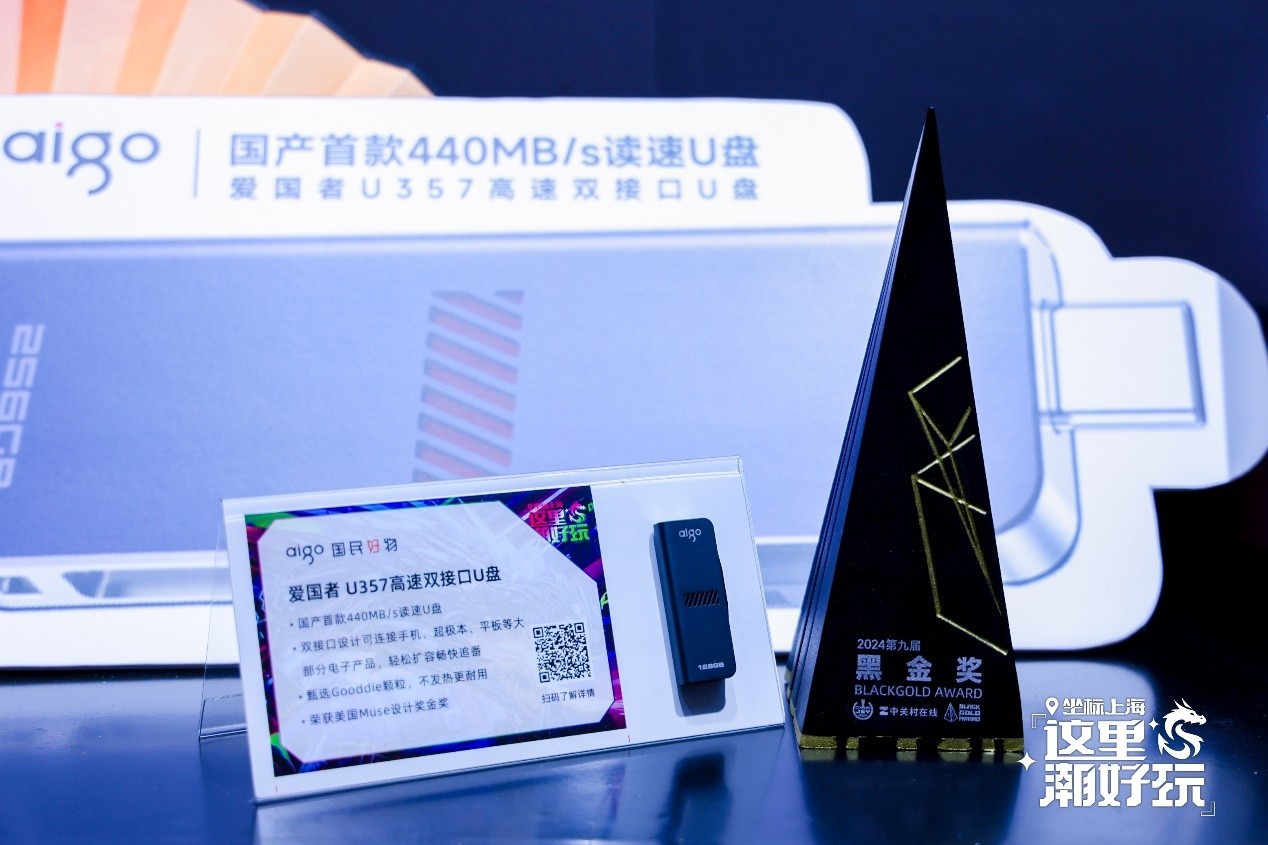 除了固态硬盘,aigo爱国者的两款U盘也凭借极强的性能表现受到观众的亲睐。其中旗舰产品aigo Z398 Pro高速双接口固态U盘的性能极为夸张,最高可达1070MB/s的读取速度,让现场观众感受到了来自aigo爱国者的亿点点震撼。aigo U357高速双接口U盘同样是一款性能极强的产品,其读取速度高达440MB/s,同样超出了不少现场观众对于U盘的认知。更为关键的是,aigo U357的售价极具竞争力。正是凭借出众的性能和超高的性价比,aigo U357荣获了中关村在线颁发的2024黑金奖——最佳新品奖。