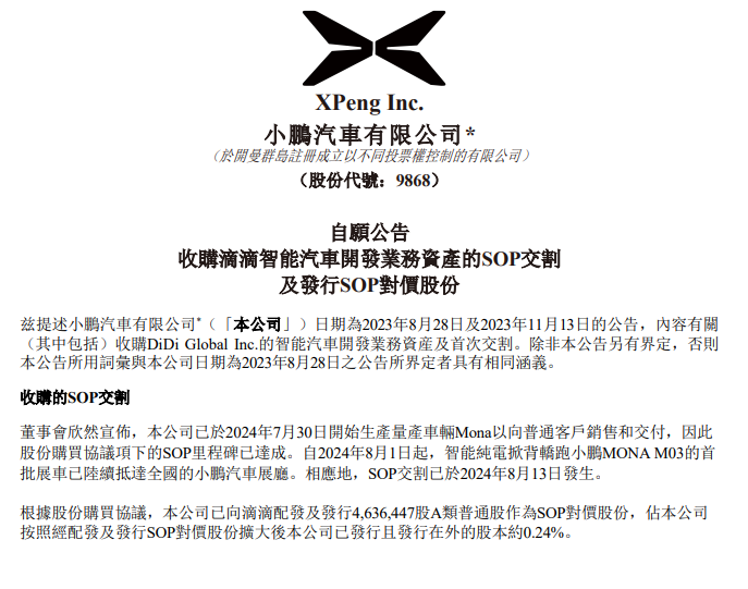 小鹏汽车近日发布公告,宣布已经完成了对滴滴智能汽车开发业务资产的 SOP 交割。根据股份购买协议,小鹏汽车向滴滴配发及发行了4,636,447股 A 类普通股作为 SOP 对价股份,占该公司按照经配发及发行 SOP 对价股份扩大后本公司已发行且发行在外的股本约0.24%。