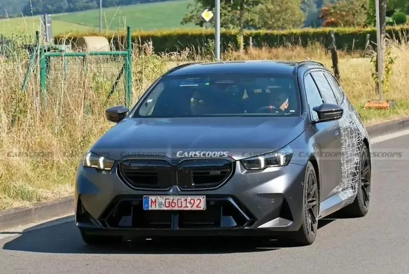 近日,据网友透露,宝马将于8月15日正式发布2025款M5 Touring高性能旅行车。新车前脸与M5轿车相似度较高,采用部分封闭式格栅和标志性的前灯设计。车身侧面配备了轻量化轮毂、高性能刹车系统(配备铜色卡钳)和米其林Pilot Sport轮胎。此外,隐藏式门把手和充电口的设计暗示了插电式混合动力系统的应用。