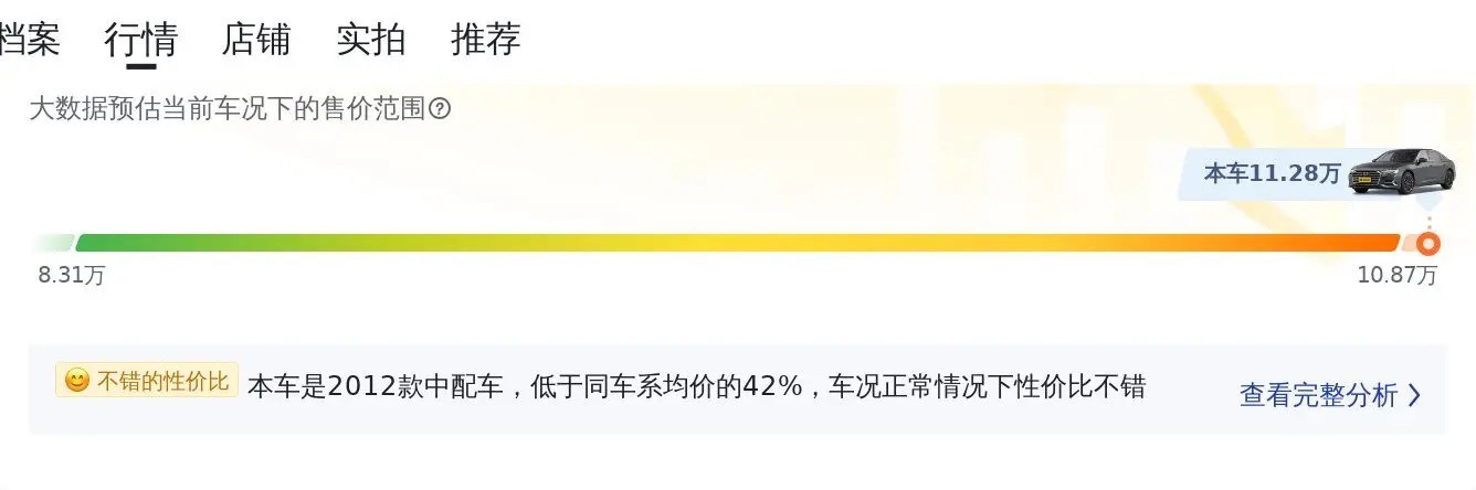 车辆信息显示,这辆车是2012款TFSI标准型,定位中大型车,黑色车身搭配深色内饰。新车含税价为44.66万,目前二手车报价11.28万,首次上牌时间为2013年8月,并过户1次。累计行驶里程达到14万公里,符合国IV排放标准。