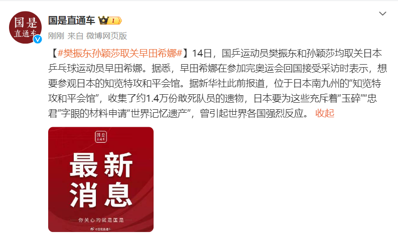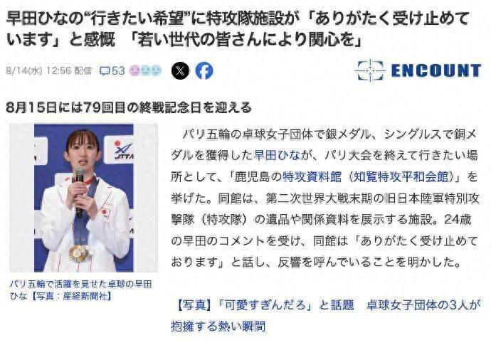 据悉,早田希娜在参加完奥运会回国接受采访时表示,想要参观日本的“知览特攻和平会馆”。