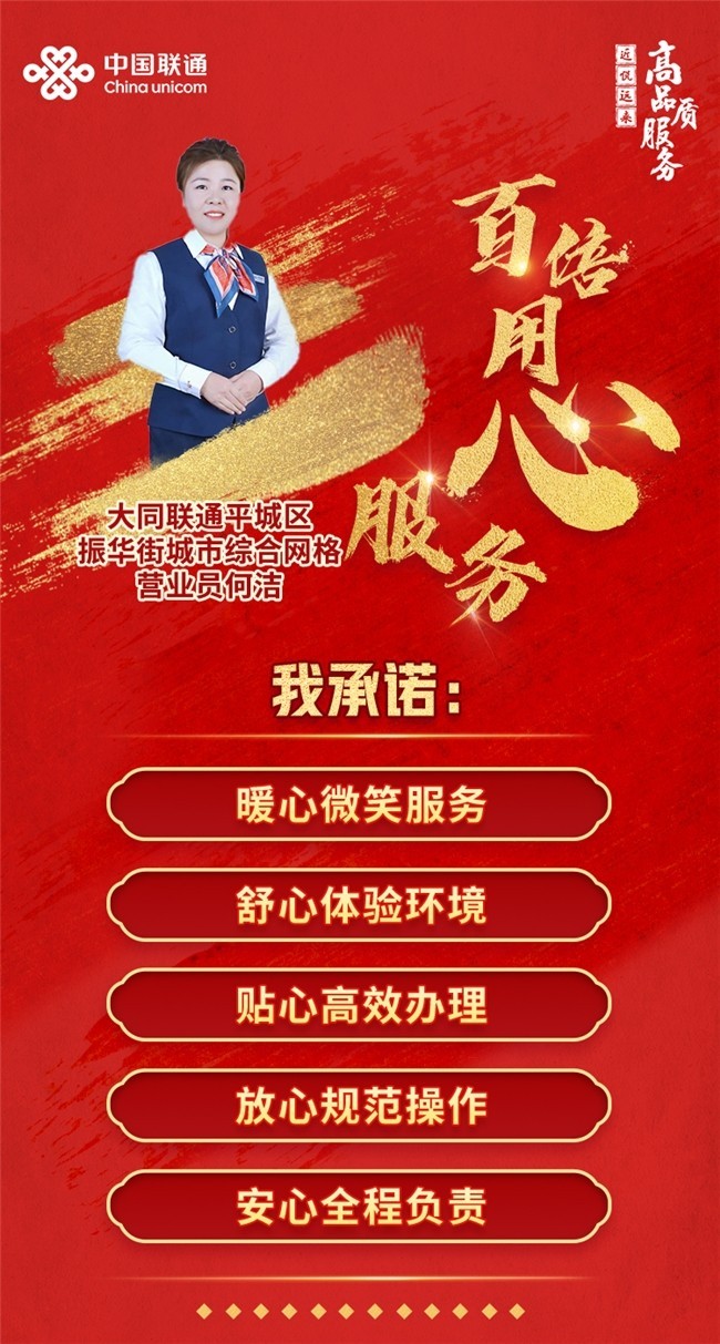 “联通好服务,用心为客户”不只是一句标语,更是联通人的行动指南,思想方针。在大同联通平城区振华街综合营销网格有一位“想客户之所想、急用户之所急”的工作人员,她就是营业员——何洁。她以耐心服务著称,赢得了无数客户的信任和好评,以服务为圆心 以真心 细心 耐心 诚信诠释着“联通好服务,用心为客户”的服务理念。