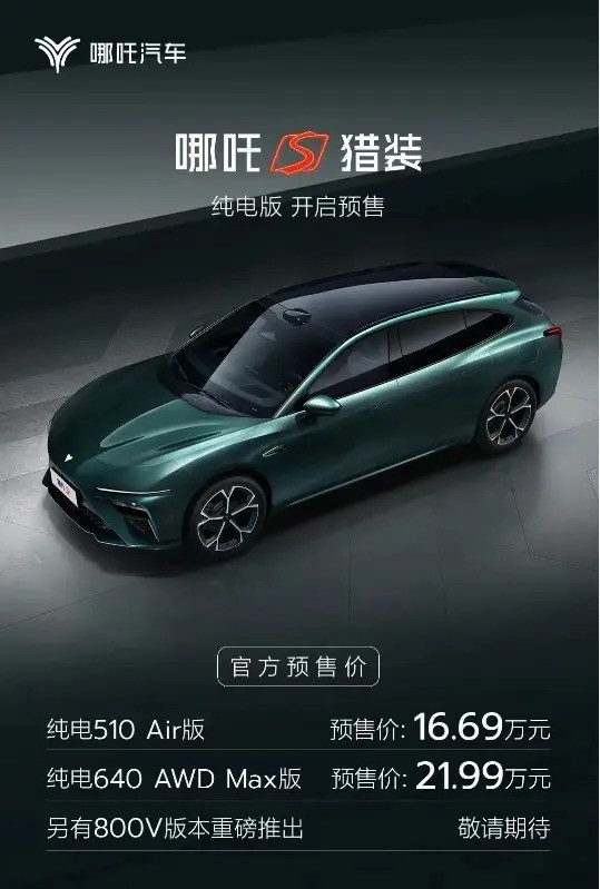 8月15日,哪吒汽车正式开启了哪吒S猎装纯电版的预售。这款新车的510 Air版预售价为16.69万元,而性能更强劲的640 AWD Max版则预售价为21.99万元。据悉,未来,哪吒S猎装还将推出基于800伏平台的新版本。