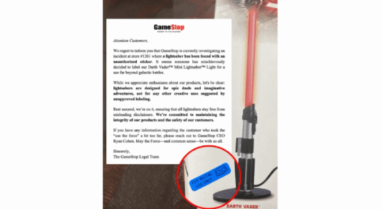 需要特别注意的是,这些商品仍然可以出售给未成年人消费者。然而,GameStop商店官方很快注意到这次恶作剧引发了争议,并发布了公告澄清并对恶作剧的始作俑者提出警告:“达斯·维达光剑上出现了恶作剧标签。这些光剑是为史诗般的决斗和充满想象力的冒险而设计的,并不是恶搞标签上提到的用途。”