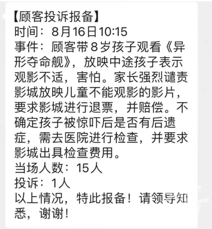 据传一家影城接到投诉,一家长称自家8岁小孩观看异形被吓坏,要求赔偿。