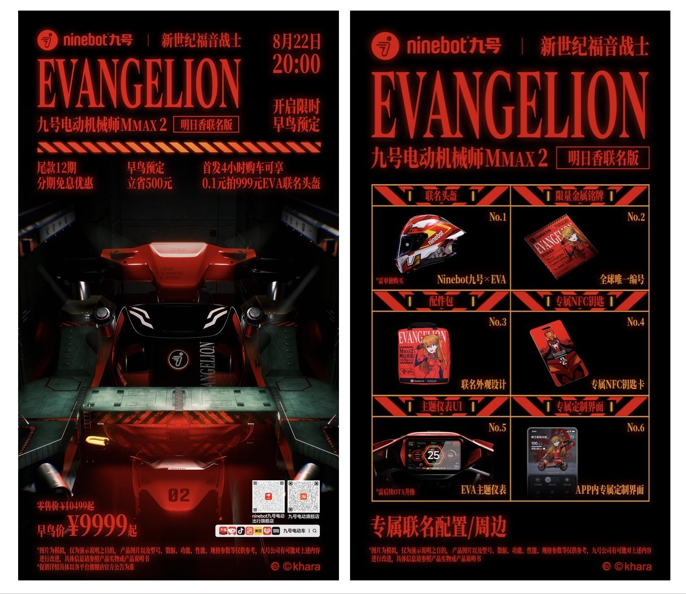 除了联名车型,此次联名企划还推出了一系列联名合作周边,让EVA的粉丝倍感惊喜。其中包括九号电动EVA2号机&明日香联名全盔(需单独购买)、全球唯一编号金属铭牌、联名外观设计配件包、定制NFC卡片钥匙,以及九号出行App内专属动态界面、主题仪表UI等。让你从出发到抵达,一切都很EVA!