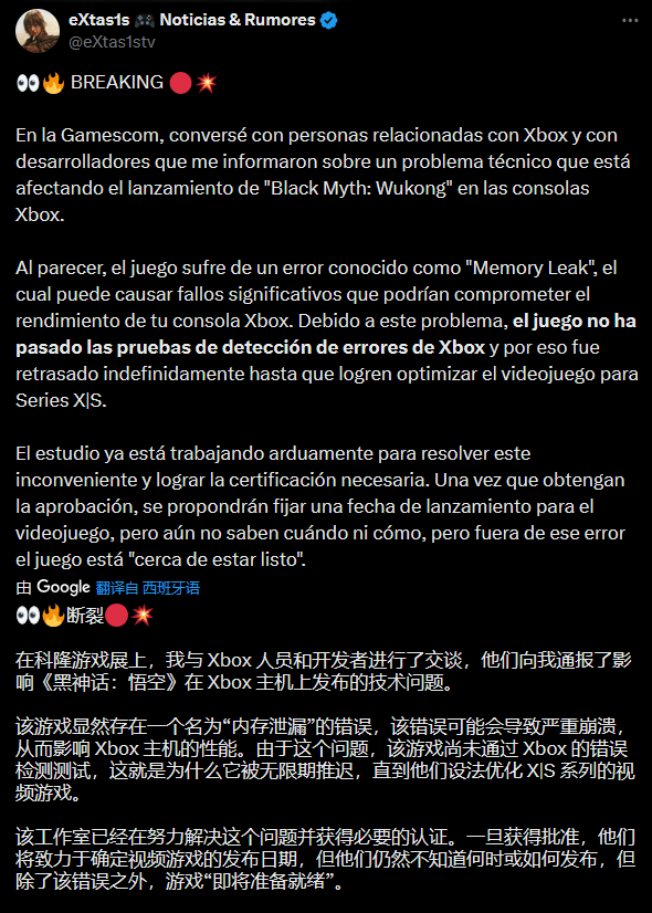 根据西班牙爆料者eXtas1s的透露,延期发布的原因是开发团队在制作《黑神话 悟空》时遇到了内存泄漏问题,导致游戏运行过程中崩溃。这个问题使得该作未能通过Xbox部门的BUG检测测试。目前尚不清楚XSX与XSS版本是否存在相同的问题,需要解决这个问题后,才能正式上线。