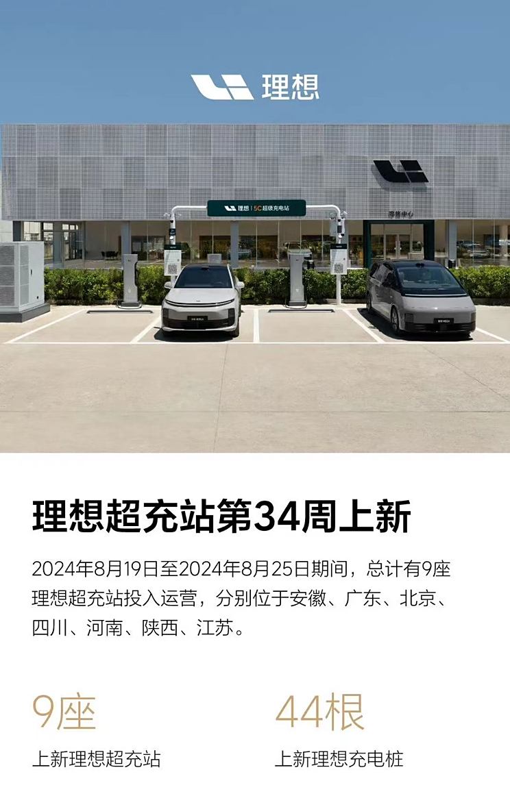 近日,理想官方公布了2024年第34周的超充站建设进展情况。在这一周内,理想汽车共建设了9座新的超充站,并且投入运营了44根充电桩,分别位于安徽、广东、北京、四川、河南、陕西和江苏等地。
