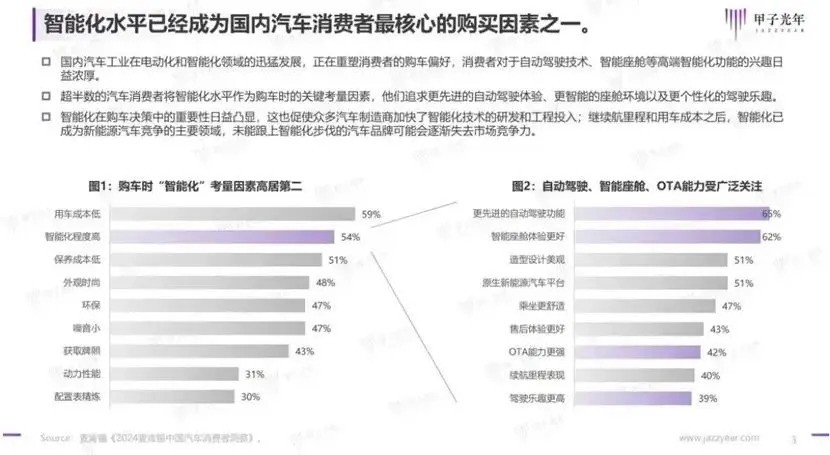 根据甲子光年智库发布的《2024自动驾驶行业研究报告》显示,汽车智能化正在逐渐普及。在购车时,有54%的消费者将智能化水平列为关键考虑因素。他们渴望拥有更先进的自动驾驶体验、更智能的座舱环境和个性化的驾驶乐趣,对高端智能化功能越来越感兴趣。