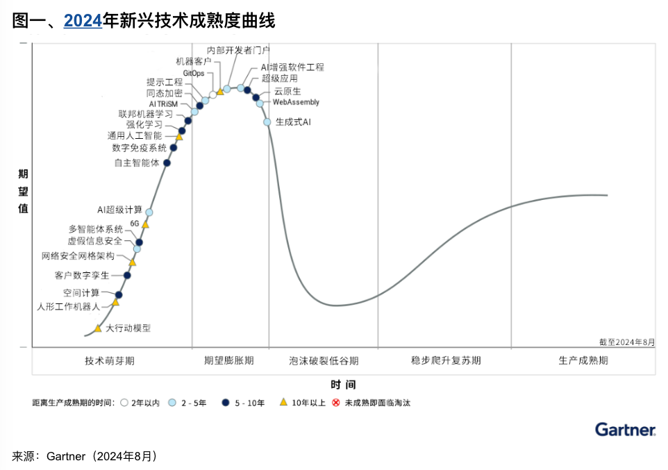 根据Gartner发布的2024年新兴技术成熟度曲线,目前收录的25项颠覆性技术可以分为四大领域:自主AI、开发者生产力、全面体验以及以人为本的安全和隐私计划。这些新兴技术有望在未来二至十年内为企业机构带来巨大的竞争优势。