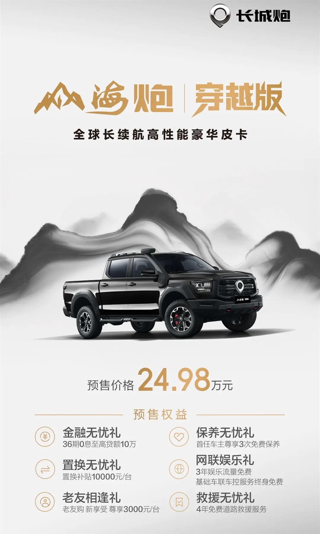 长城旗下山海炮穿越版正式开始预售,预售价格为24.98万元。新车基于坦克平台打造,标配双油箱,综合续航1400km,专为满足越野穿越需求而升级。山海炮最低售价为22.87万元起,最高降价为0.01万元。