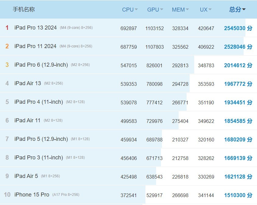 从得分情况来看,第一名iPad Pro 13 2024得分超过2545030分,而第十名iPhone 15 Pro则为1510300分,性能分值差异明显。当然两类设备的定位上也有明显差异,iPad的大尺寸作为便携式的生产力+娱乐功能,确实也需要更强的性能去支持。