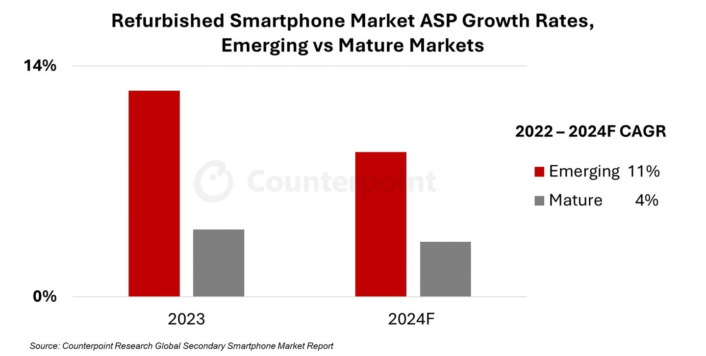 具体到市场细分方面,在许多发达市场中,翻新智能手机已经接近高端手机的水平。然而,在新兴市场中,翻新手机占据了大部分全球需求,并且其平均销售价格(ASP)的增长速度几乎是发达市场的三倍。