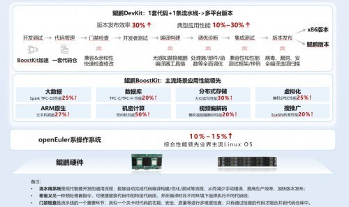 鲲鹏应用使能套件BoostKit面向大数据、数据库、分布式存储、虚拟化等八大主流应用场景,提供鲲鹏软硬协同全栈调优的使能套件,包括应用加速软件包、基础加速软件包、高性能开源组件、参考实现等,使能伙伴极致性能;同时,还提供WAAS负载感知加速系统,能够基于单个计算任务深度调优,启用最优加速库,自动配置全栈最佳参数。开发者可以在代码开发过程中安装并使用BoostKit加速能力,打造更具竞争力的水平解决方案,典型场景性能提升10~30%。
