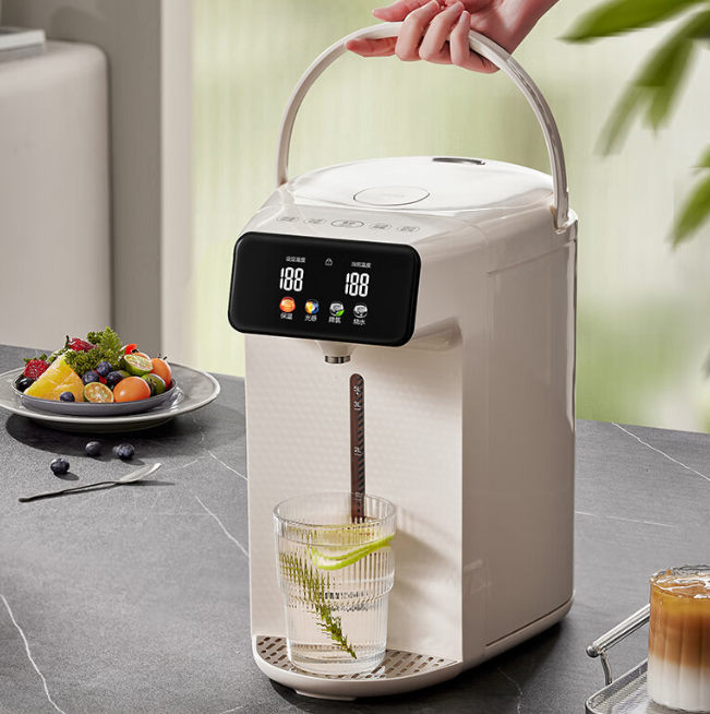 新品配备前置数显彩屏,能实时显示壶内的温度,用户可通过触控设定想要的温度(40℃至95℃多段可选)。此外,该产品还支持自来水和纯净水两种模式煮水,并具备快速加热功能,一次可煮沸5升水量,在长沸模式下可以降低自来水中的氯气残留。