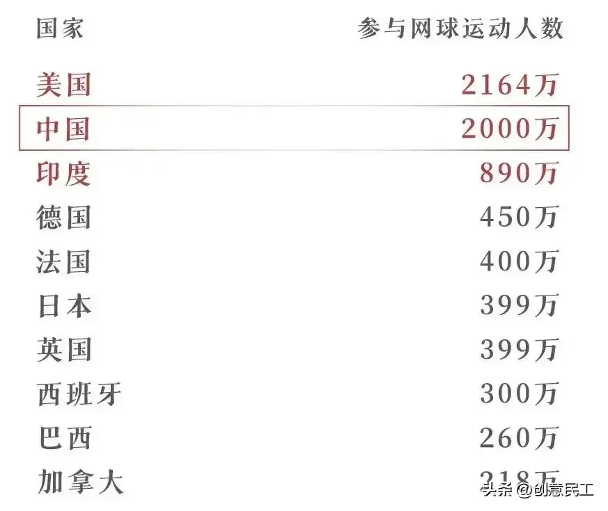 根据国际网球联合会(ITF)发布的《2021年全球网球报告》,2020年中国就有约2000万人参与(每年至少打一次)网球运动,全国参与人数排世界第二,仅次于美国。