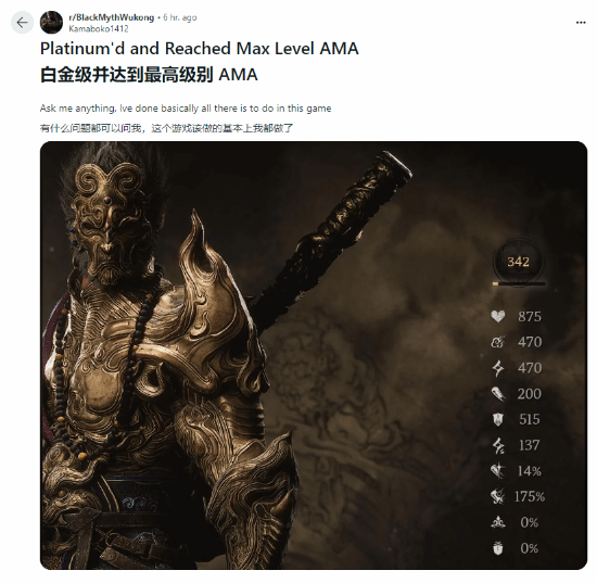近日,一位玩家在海外论坛上炫耀了他成功解锁《黑神话:悟空》的白金和满级成就。他表示,在这个游戏中,新版本难度更高,敌人的防御力也有所提升,但同时保留了所有的升级、盔甲和技能等成果,因此总体来说游戏体验更加轻松。