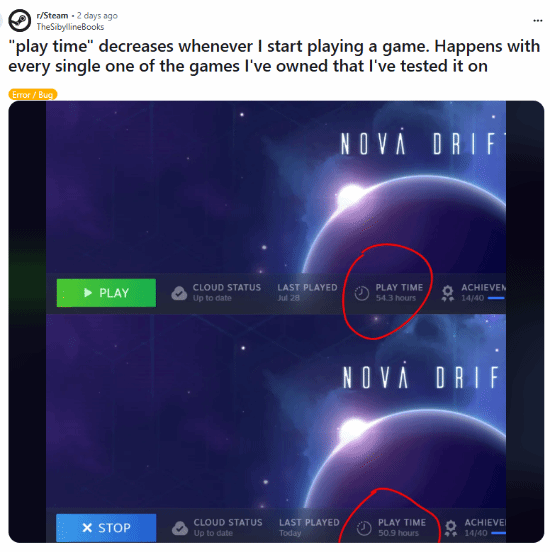 具体来说,这位玩家正在玩一款名为《新星漂移》的太空战斗游戏,上半场显示的游戏总时长为54.3小时,在启动游戏后,该数据变为了50.9小时。对此现象,有网友猜测可能是由于V社的操作引起的,并且有人表示自己使用Steam Deck离线玩耍时也遇到了同样的问题。