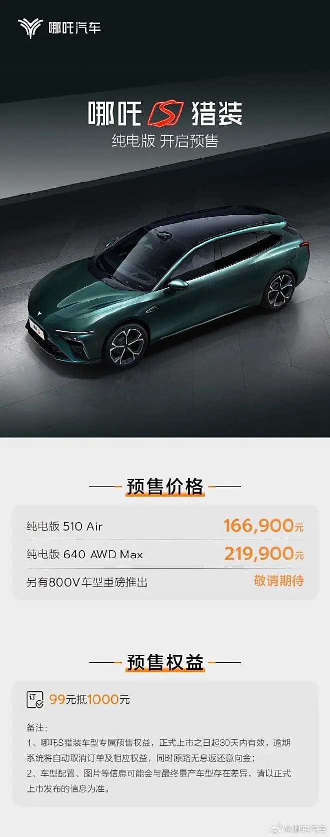 哪吒汽车近日公布了其新款哪吒S猎装纯电版车型的预售价。新车提供3款车型,其中包括510 Air单电机版车型的预售价为16.69万元,640 AWD Max双电机四驱版车型的预售价为21.99万元,另外还有一款800V平台车型的官方价格尚未公布。预计该车将在上市时直接公布价格。