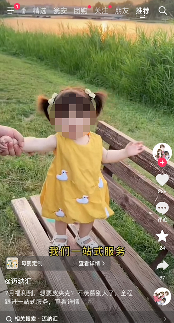 进入主页发现,该账号只发布了这一条视频。视频画面有两三岁的男童和女童,配文称“7月福利到,想要皮夹克?不羡慕别人了,全程跟进,一站式服务,查看详情”,视频左下角还配有一条“多种方案可选 查看详情”链接。