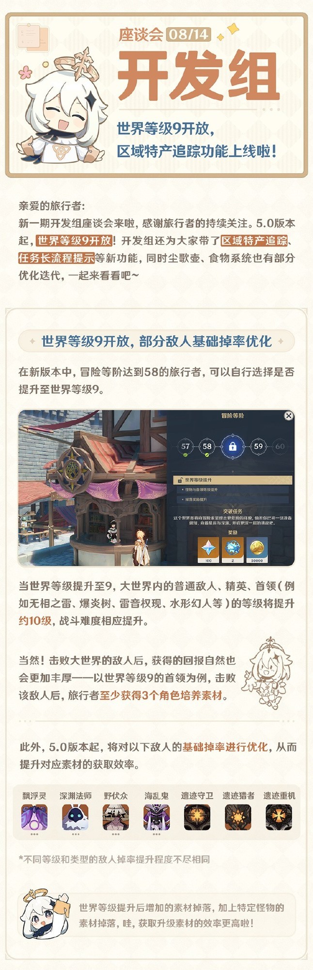 首先是世界等级9开放,对于等级达到58级的旅行者,可以自行选择是否提高到世界等级9,各种敌人包括BOSS等级会提升10级,不过掉落也更高,比如说BOSS至少掉落3个角色培养素材。