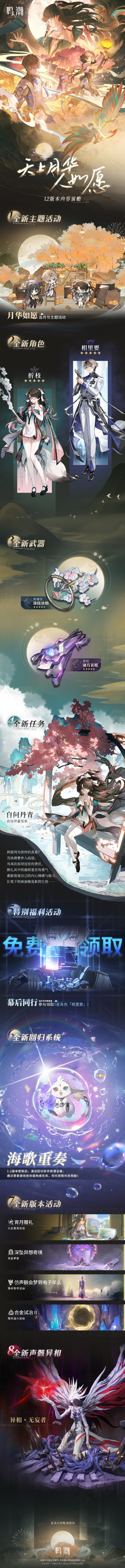 今日,鸣潮1.2版本“天上月华人如愿”正式开启,在该版本中,玩家们将体验到一系列新事件和活动。包括1.2版本主题活动追月节、新角色折枝与相里要、签到领取5+5十连活动、签到领取5+5十连活动、回归系统上线、逆境深塔优化与全服补偿等等。