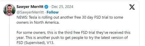通过社交媒体平台X,特斯拉向客户发布了这一消息:“您已经获得了免费的全自动驾驶(需要人工监督版)试用体验。开启全自动驾驶后,您的特斯拉汽车将在您的监督下自动转换车道,遇到岔路口时会按照您选择的导航路线行驶,并且可以自动避开其他车辆和物体。同时,在面临可能危险的情况下,比如进入交叉口或右转时,系统也会提示您采取相应措施以确保安全。”