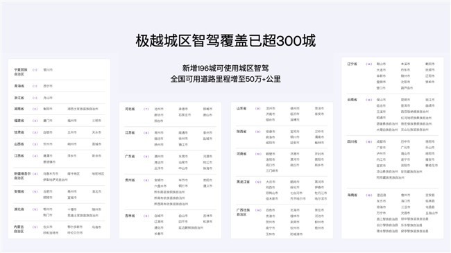 ? ? ? ?此次,V1.6.0版本升级后,极越PPA智驾的城区覆盖范围极速扩张,已覆盖全国超过300+城市,尤其包括新疆、内蒙古、吉林、海南等26个省市自治区都已支持PPA智驾,向“2024年全国都能开”的目标又迈进了坚实的一步。