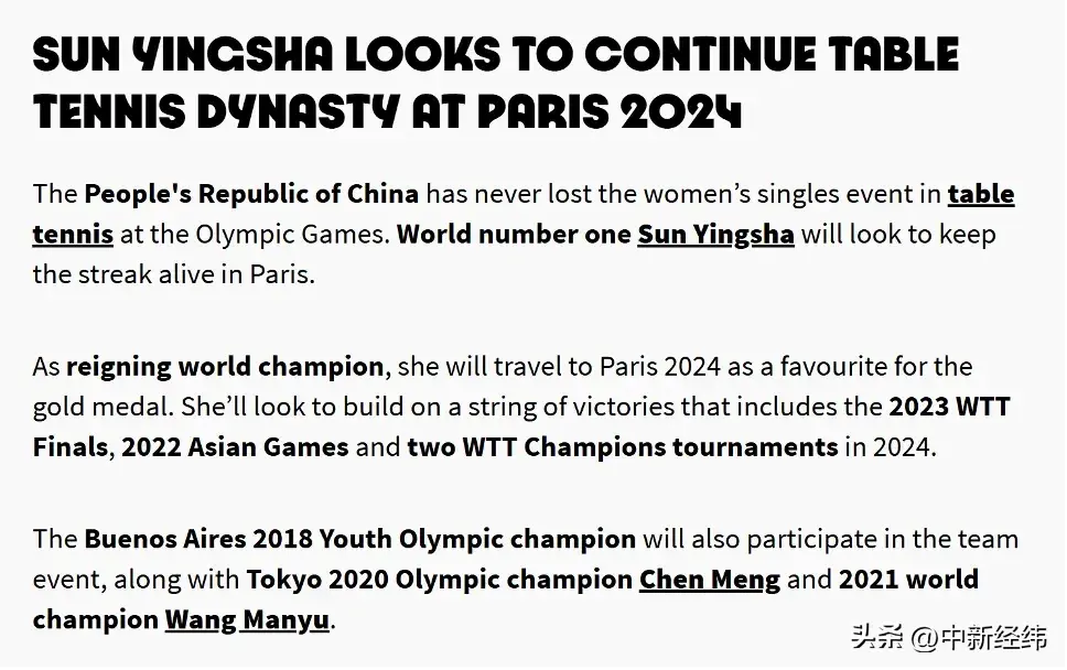 时间回拨至奥运会开幕式前的7月9日,巴黎奥运会官网发布文章“Twelve of the biggest athletes to watch at Paris 2024”,推荐本届奥运最值得关注的12位顶级运动员,孙颖莎与美国体操名将西蒙·拜尔斯、篮球超级巨星勒布朗·詹姆斯等在列。