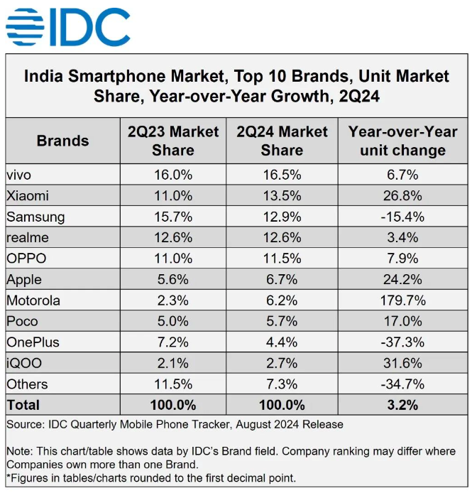 根据IDC最新发布的《全球季度手机跟踪报告》,印度智能手机市场在2024年上半年出货6,900万部,同比增长7.2%。其中,小米继续领跑入门级市场,市场份额为14%,较去年同期的22%有所下降。紧随其后的是Poco和realme。