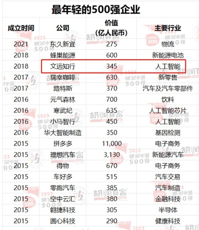 胡润百富是全球提供有质量的榜单与调研的权威机构,据悉,本次榜单按照上市企业2023年11月15日的收盘市值计算,非上市公司估值参考同行业上市公司或根据最新一轮融资情况进行估算。文远知行则以2017年成立、345亿的估值被评为“最年轻的500强企业”。