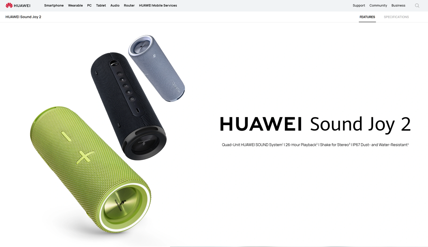 华为海外官网近日上架了新款蓝牙音箱Sound Joy 2,这是一款与之前产品相比有很大进步的音响产品。首先,它配备了4个单元的HUAWEI SOUND系统,包括20W全频扬声器、10W高音扬声器和两个无源辐射器。这个系统能够释放出高达85 dB(A)的音量,并且高音扬声器采用丝质振膜,可以提供20kHz的高音。