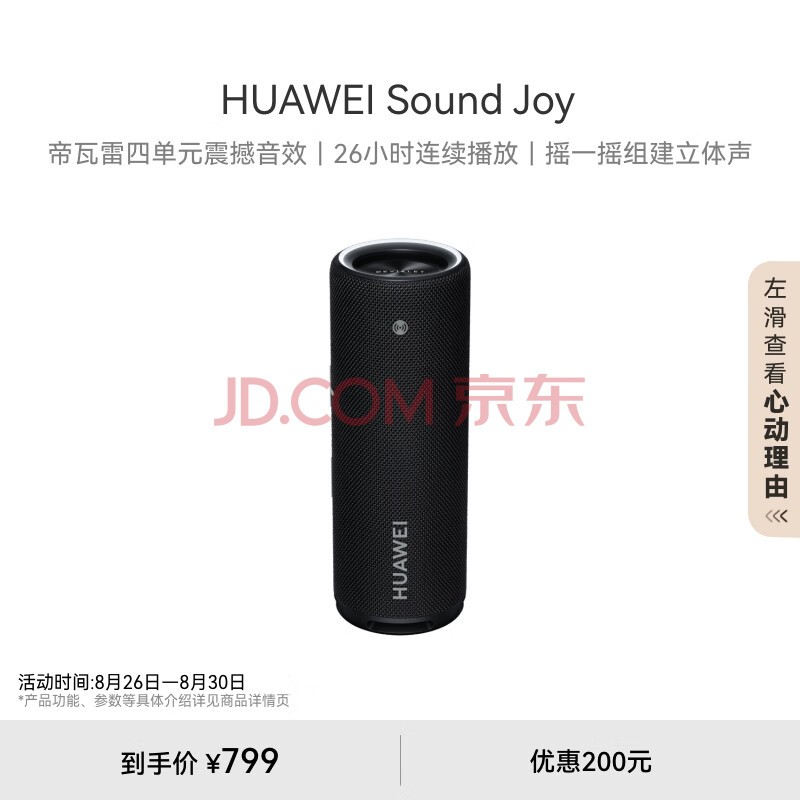 其次,这款音箱内置了8800mAh电池,播放时间长达26小时。同时,它还支持40W Type-C充电,在充电10分钟的情况下就可以听歌一个小时。此外,用户还可以通过摇晃两台Sound Joy扬声器来完成配对,并且可以使用华为智能手表控制音乐播放和调节音量。