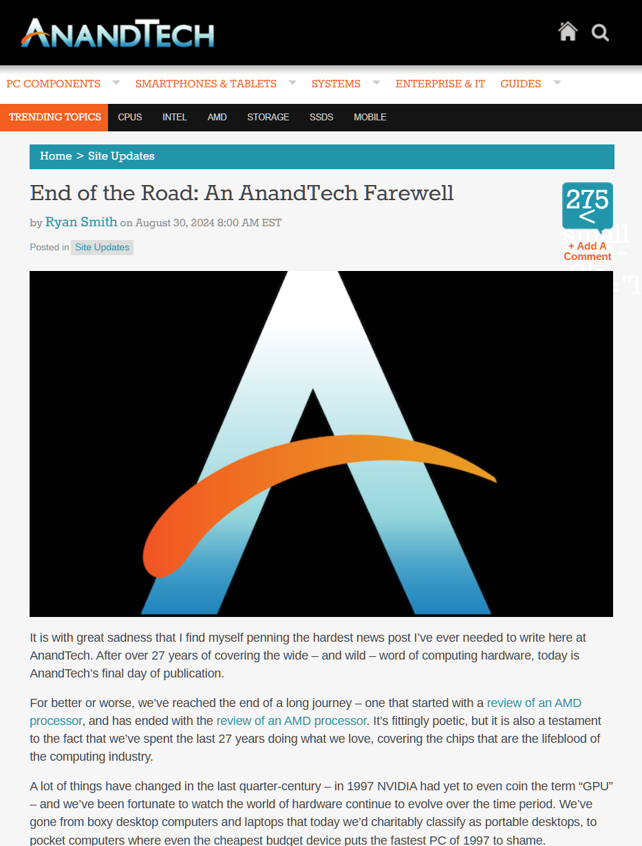 PC硬件领域重磅站点AnandTech即将关停 27年历程不忘初心