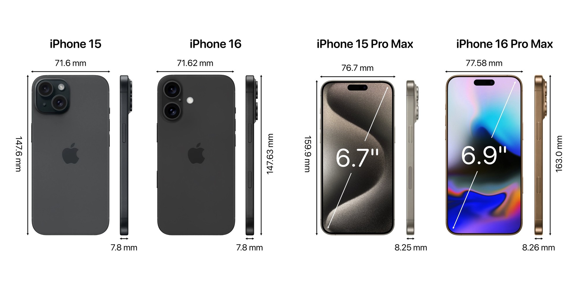 屏幕尺寸变大:iPhone 16、iPhone 16 Pro的屏幕尺寸从6.1英寸变成6.3英寸,另外两款加大到6.9英寸。
