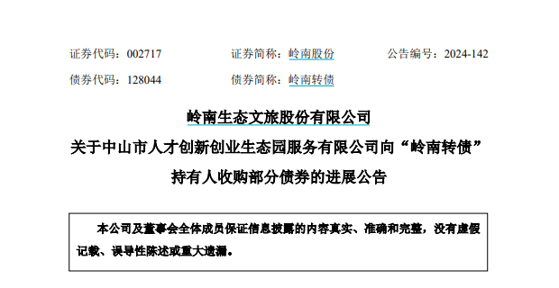 8月21日,公司公告称,收到中山市人才创新创业生态园服务有限公司的通知,明确将向“岭南转债”持有人收购部分“岭南转债”,并公布相关方案。
