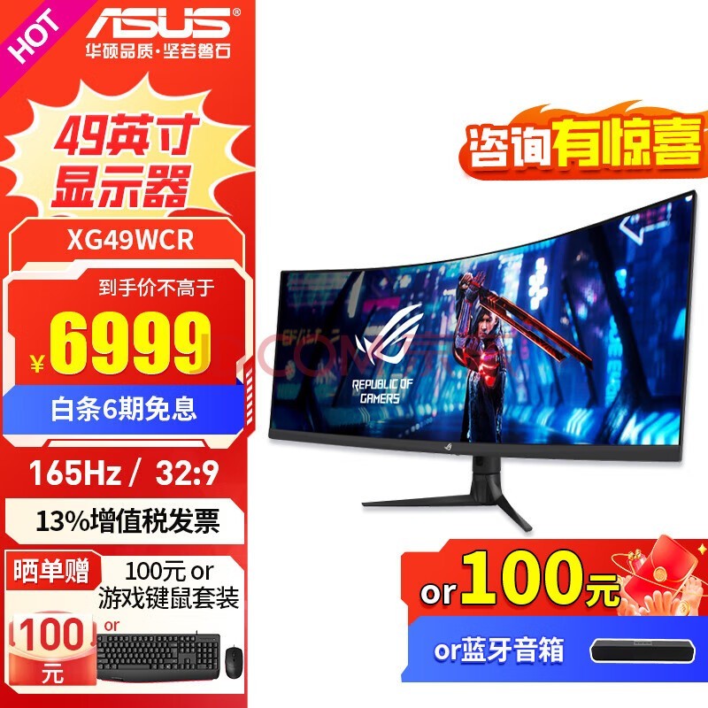 华硕 玩家国度ROG XG49WCR 49英寸 165Hz宽曲面显示器 HVA快速1ms电竞显示器 ROG 32:9 165Hz 1800R曲面带鱼屏