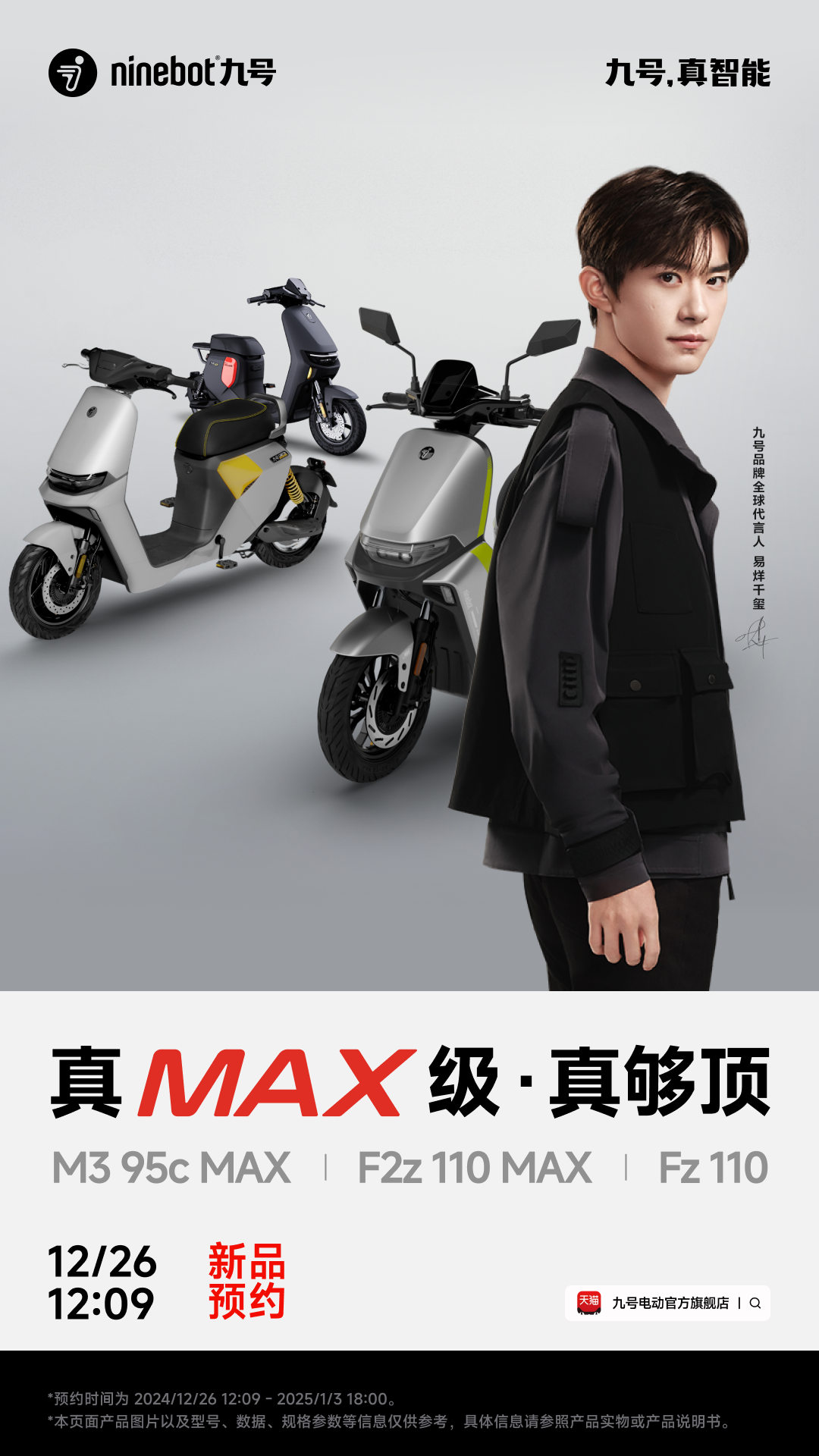 九号电动今日公布了三款新品,分别是M3 95c MAX、F2z 110 MAX以及Fz 110。这三款电动车已经开始接受预订,并将于1月3日18:00正式发布。根据官方公布的信息,M3 95c MAX是一款铅酸电摩,配备了72V 32Ah的铅酸电池,最高车速可达65km/h,标称续航里程为82km。该车还搭载了3300W峰值功率的电机,并且配备了前后碟刹系统、五级可调后减震和双通道ABS刹车系统。