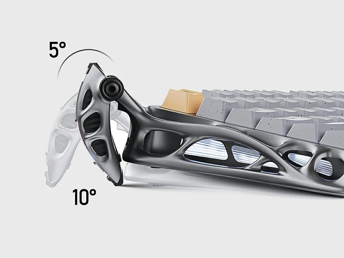 Mercury K1 Pro采用骨架式铝合金外框,尾部左右两端各有一只“脚”,可通过内收外扩的变化调节键盘倾角,起到脚撑作用。标准款键盘采用混凝土灰(国内称星际银)配色,正面主体为灰白外观,PBT键帽四周不透明,并在顶部点缀以类混凝土黑色斑点;而特别版则采用“赛博朋克”配色,整体呈现金属黑色,PBT键帽四周透明,并在顶部根据区域差异拥有不同色彩风格。